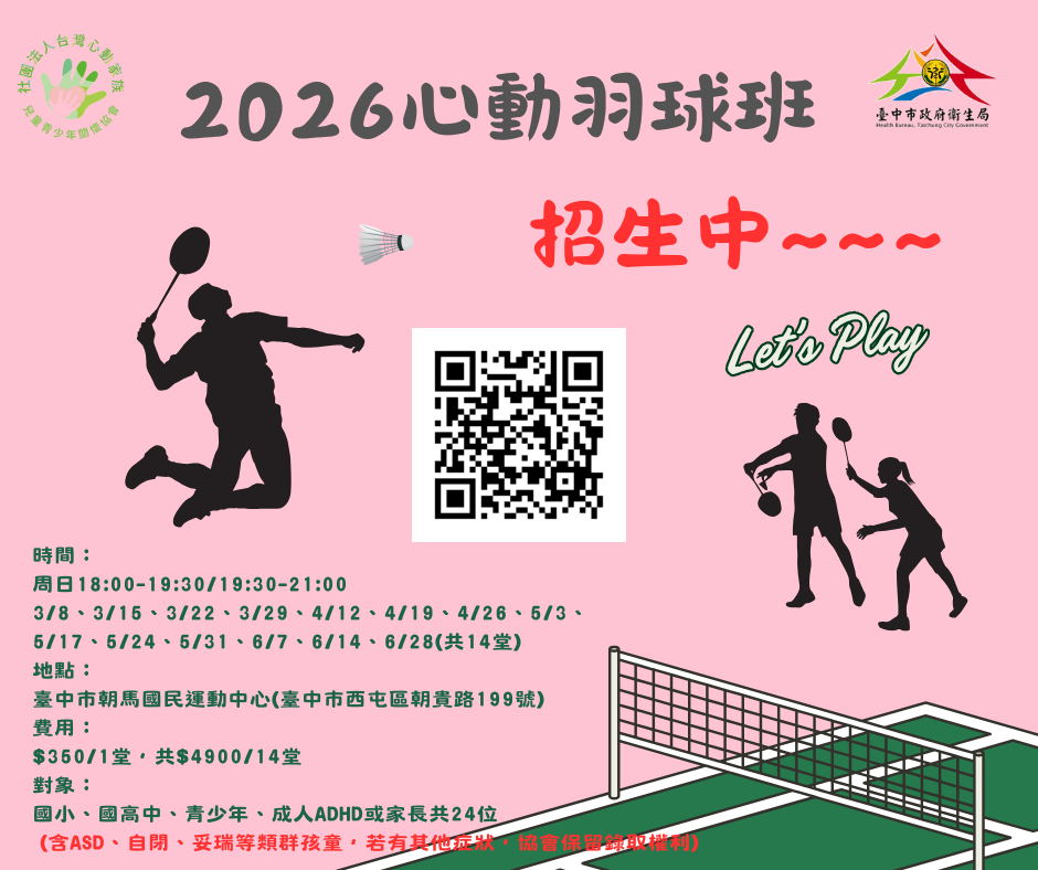 【課程資訊】 時間:每周日18:00-19:30/19:30-21:00 日期: 3/8、3/15、3/22、3/29、4/12、4/19、4/26、5/3、 5/17、5/24、5/31、6/7、6/14、6/28(共14堂) 地點:臺中市朝馬國民運動中心(臺中市西屯區朝貴路199號) 費用:$350/1堂,共$4900/14堂 對象: 國小、國高中、青少年、成人ADHD或家長共24位 (含ASD、自閉、妥瑞等類群孩童,若有其他症狀,協會保留錄取權利) 報名表單: https://forms.gle/8PTy34NMXaraymbx5