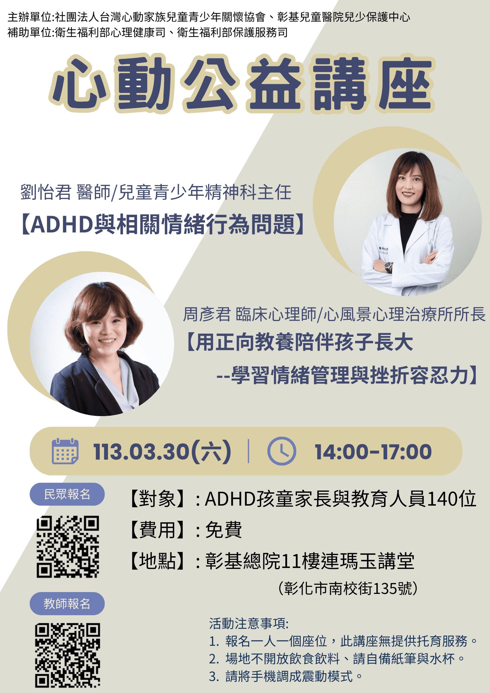 【講座主題】ADHD與相關情緒行為問題、用正向教養陪伴孩子長大--學習情緒管理與挫折容忍力