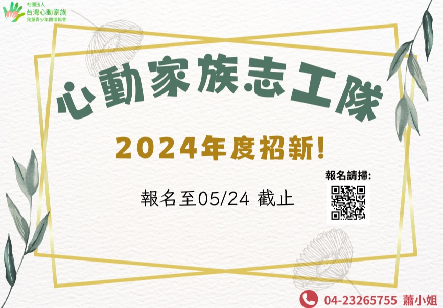 2024年心動家族志工隊第一次招募開跑囉, 若您已參與協會相關活動半年以上,對於協助有初步了解 想要進一步協助協會辦理課程活動及相關事務 都歡迎您手刀點選已下連結做報名唷(down) 報名連結: https://forms.gle/3ytk9wEKgS9e723cA 報名期限:即日起至5/24